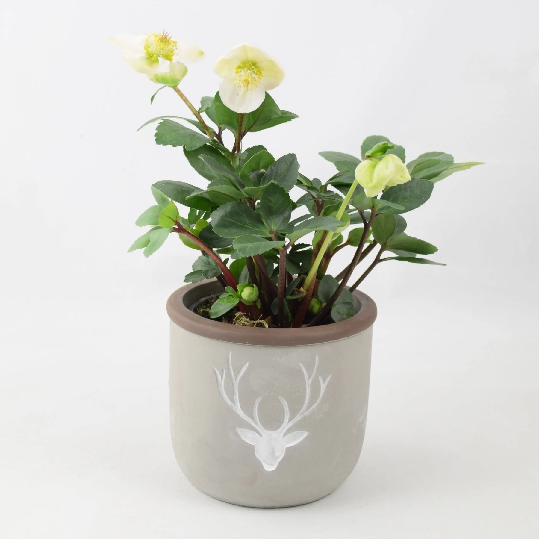 Celebrate the colder months with the timeless charm of Hellebore planted in a decorative 12cm concrete stag pot. This semi-evergreen plant blooms from autumn through to spring, bringing colour and life to your home when most plants are dormant. A perfect addition to your winter décor, this freshly planted hellebore is both stylish and seasonal.