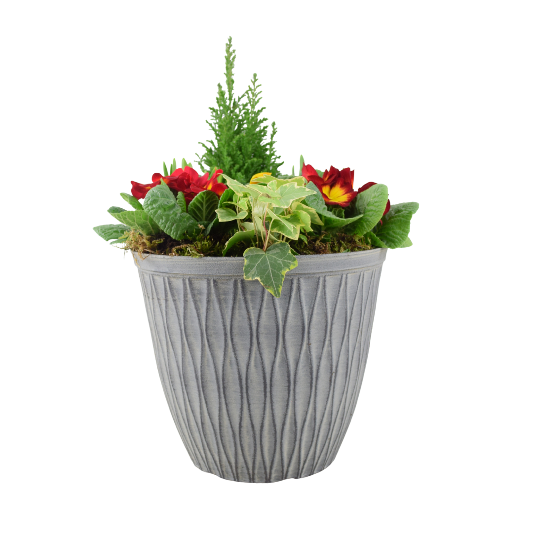 Plant Mix: A mix of seasonal bedding plants (e.g., Pansies, Violas, Primulas) in vibrant colours, trailing ivy/foliage (plant varieties may vary slightly depending on seasonal availability).