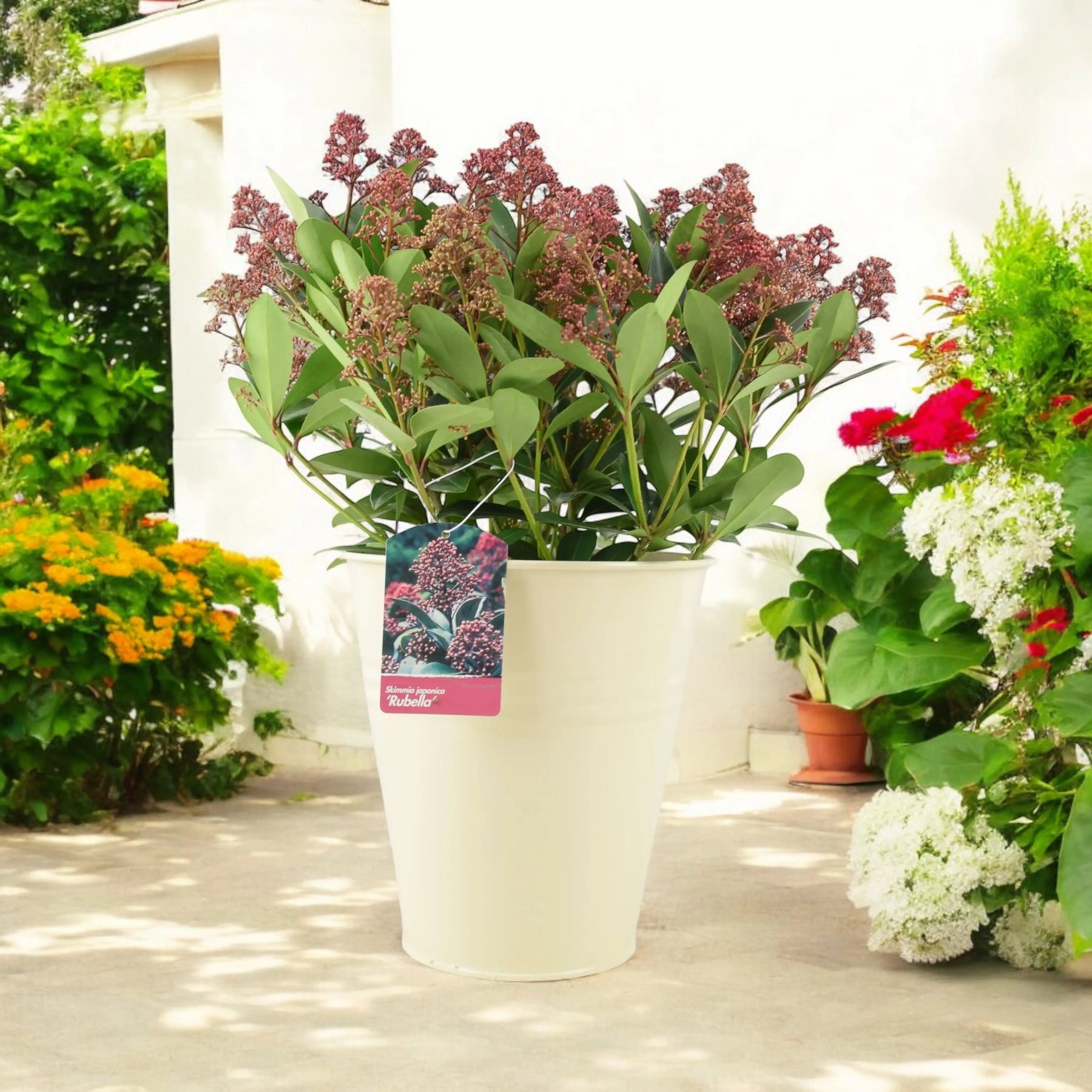 Skimmia Rubella prefers partial shade and thrives in moist, well-drained soil. Avoid placing in full sun, which can scorch the leaves. Feed with an ericaceous fertiliser in spring for optimal flowering and foliage health.